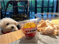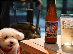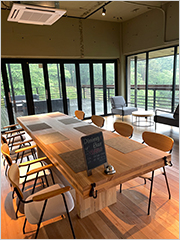 ダイニングバーの店内はもちろん全席犬連れOK!大きなダイニングテーブルを囲む席の他、ソファ席やテラス席などいろいろなタイプの座席があり、木のぬくもりを感じられる落ち着いた雰囲気の中、ドッグヴィラが並ぶ敷地全体の眺望や山あいの緑を楽しむことができます。 |
