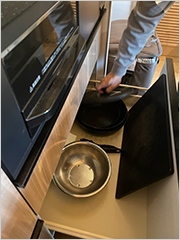 実際には、デッキの高低差や各棟の壁・屋根の構造で、容易に入浴シーンを披露できない仕様になっていると思いますが、例えば我が家が借りたお部屋だと、お風呂から見えているお隣さまが、何か用事があって車庫に止めている車のほうに出てきたら、素っ裸の私とバッチリ目が合うな、という位置関係でありました。ですので、この外風呂を使う際には、ちょっと周りの様子を確認したり、開放できるドア(壁)の開き具合を調整したりしてみると良いかもしれません。