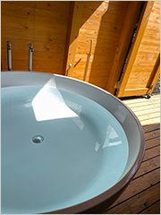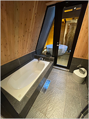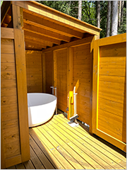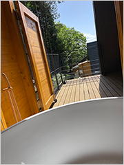 露天風呂は、内風呂から続くウッドデッキに設置されています。四方が木の壁に囲われていて、一方向だけ開放できるドアの仕様になっています。