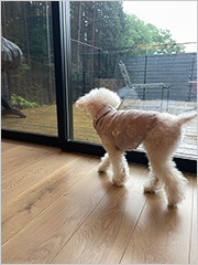 天井が高く開放的な平屋仕様で、リビングスペース・ダイニングスペース・フルサイズのキッチン・ベッドルームがワンルームに配置されています。そして、犬たちが滑りにくい床の素材!これはとても嬉しいポイントでした。