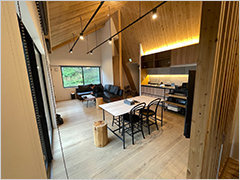 一棟貸しのプライベートコテージは、開放的な大窓やテラスのある面と、景色を楽しみつつお隣さまの人目が気にならないよう工夫された傾斜のあるある屋根・壁一体型の作りがモダンな印象です。