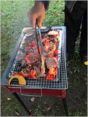夕食は、バーベキューだったので天気を心配していましたが、雨対策として、庭に大きなテントを張ってバーベキューの準備をしていてくれていました。用具はすべて、宿のほうで用意をしてくれているので、手ぶらで大丈夫です。 |