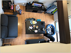 朝食は自炊です。トーストとベーコンエッグと地元の牛乳という簡単な朝食を作り、リビングでいただきました。2階からリビングを見下ろせるので、上から食卓を写してみました。愛犬には昨夜の残りのお肉もあげました。