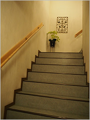玄関には足ふきタオルが置かれていました。すぐ階段があり、2階が客室になっています。2階はまるまるワンフロアで、テーブルとソファが3つあり、横にはベッドが2つ並べられて、一人がけのチェアも2つと小さめのテーブルもありました。コテージに泊まるとどうしても使わない部屋があるのでもったいなく感じることがありましたが、2階がまるまるワンフロアだったので開放感があり貧乏性も気にせず過ごせました。それでも2人と1ワンには広いと思いますが。