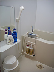 こちらのコテージは以前会社だったのか、大きい業務用エアコンがあり入った瞬間とても暖かかったです。コンセントを挿す所も大量にありました。キッチンも給湯室といった感じで、洗面所も兼ねているのですが、その奥に新しいお風呂が付いています。少し狭いお風呂ですが、洗い場があるので良かったです。