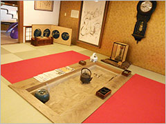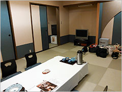 ロビーには大きな囲炉裏があり、蛇の目傘が飾られ、純和風の趣きを畳がより一層引き立てている。畳はロビーを通り過ぎても続く。どこまで続くのか…と思っているうちに2階の部屋に到着した。エレベーターは無く、ワンコ同宿の部屋は一番奥と思われるが、それほど苦にはならない。