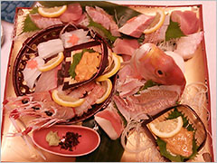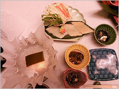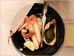 お楽しみの夕食はもちろん部屋食。プランは「板長イチ押し 茹で蟹付き冬の海幸会席」。先付け・お造り盛り合わせ・温寿司・鱧のしゃぶしゃぶ・和牛の朴葉焼き・松葉蟹浜ゆで・づけ茶漬けなどが次々と運び込まれてきた。蟹をはじめ魚介の新鮮さと美味しさは言うまでもないが身のぎっしりと詰まった蟹は見た目よりもボリューム大だ。鱧をしゃぶしゃぶで食べたのは初めてだったが、柔らかく程よい脂がのっていて、とても美味しかった。 |