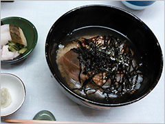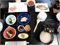 朝から茶碗蒸しとは珍しい…と思いながら、次々と箸がすすむ。焼き魚(カレイ)は小さいが身はホクホクで美味しい。鉄板焼きの厚揚げも珍しい…が、ウインナーだけが洋風なのは遊び心なのだろうか。そして味噌汁はやはりしじみ汁だった。 |