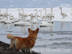 伊藤サンクチュアリには写真目当ての人が4〜5人。とてものどかで訪れる人もひとことも声を発する事もなく、じっくり丹頂の姿が眺められるよい所です。鳥たちを驚かせないように近づくと、丹頂たちは求愛のダンスを舞っています。めいは興奮したら車に戻そうと思っていたのですが、距離もあったせいか見て見ぬふり。鳴き声で耳が動くぐらいで、ほとんど興味を示しませんでした。 |