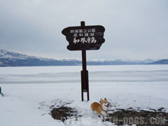 和琴レストハウスは当然閉まっていますが、前のプレートの前で記念撮影。めいは走り回ってそのうち勢い余って湖上に出ていきました。割れる事はないだろうとは思いますが、ちょっと心配です。不思議なシーンでした。 |